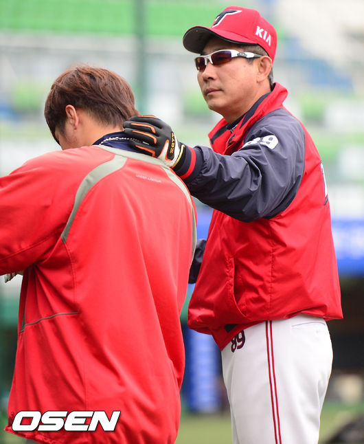 29일 오후 대구 시민구장에서 '2014 한국야쿠르트 세븐 프로야구'삼성 라이온즈와 KIA 타이거즈의 개막전 경기가 열린다. KIA 한대화 코치가 김선빈의 머리를 만지고 있다.