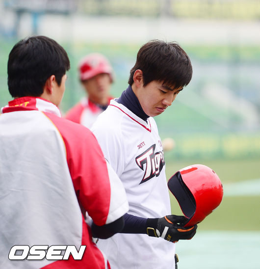 29일 오후 대구 시민구장에서 '2014 한국야쿠르트 세븐 프로야구'삼성 라이온즈와 KIA 타이거즈의 개막전 경기가 열린다. 경기 전 KIA 이대형이 헬멧을 바꿔써 보고 있다.