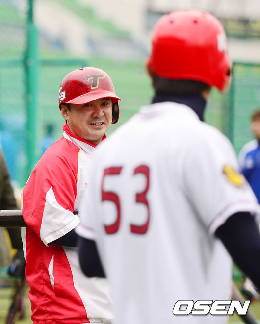 29일 오후 대구 시민구장에서 '2014 한국야쿠르트 세븐 프로야구'삼성 라이온즈와 KIA 타이거즈의 개막전 경기가 열린다. 경기 전 차일목이 이대형과 얘기를 나누고 있다.