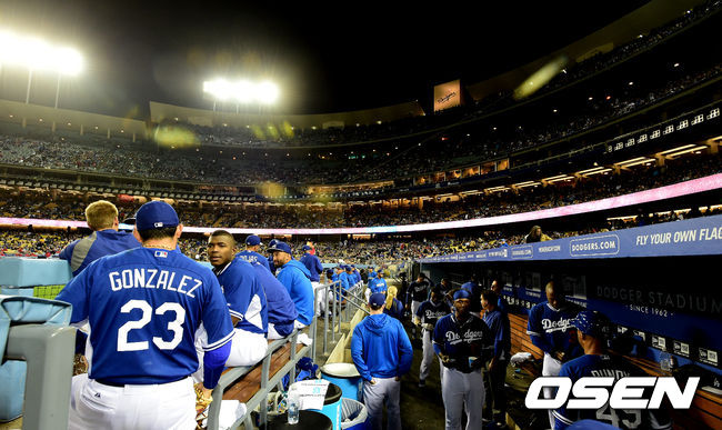 2회말 다저스 공격, 다저스 선수들이 더그아웃에서 경기를 지켜보고 있다.