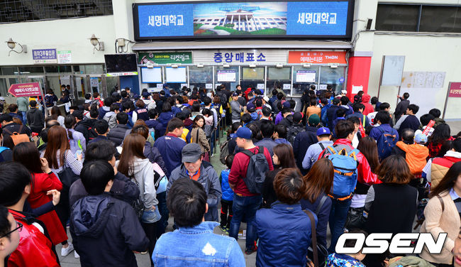 29일 오후 서울 잠실구장에서 열린 '2014 한국야쿠르트 세븐 프로야구' 두산 베어스와 LG 트윈스의 경기에 앞서 수많은 야구 팬들이 매표소 앞에서 줄을 서서 대기하고 있다.