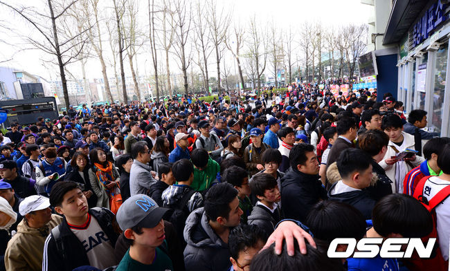 29일 오후 서울 잠실구장에서 열린 '2014 한국야쿠르트 세븐 프로야구' 두산 베어스와 LG 트윈스의 경기에 앞서 수많은 야구 팬들이 매표소 앞에서 줄을 서서 대기하고 있다.