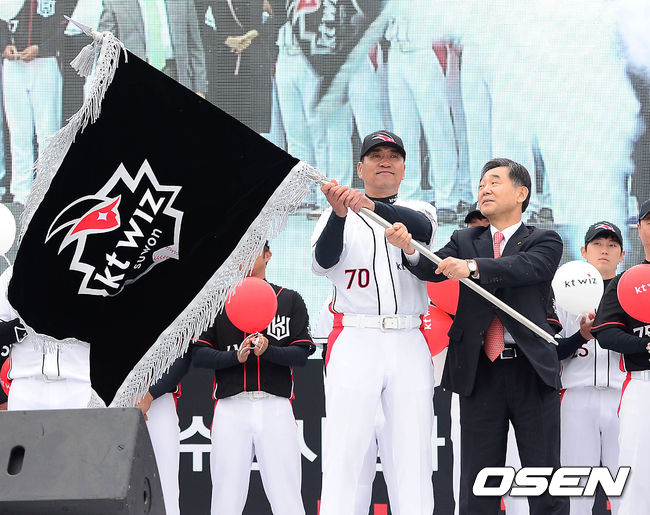 Kt 조범현 감독과 김영수 Kt 스포츠 사장이 구단기를 흔들고 있다.