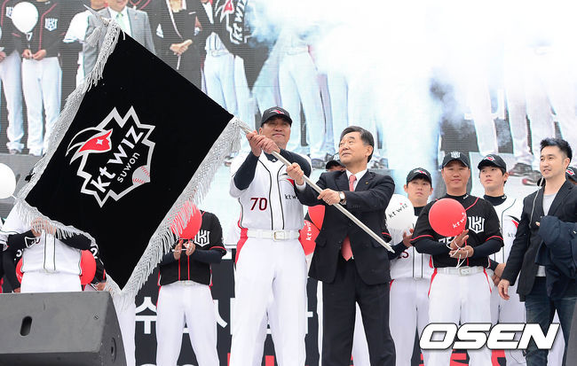 Kt 조범현 감독과 김영수 Kt 스포츠 사장이 구단기를 흔들고 있다.