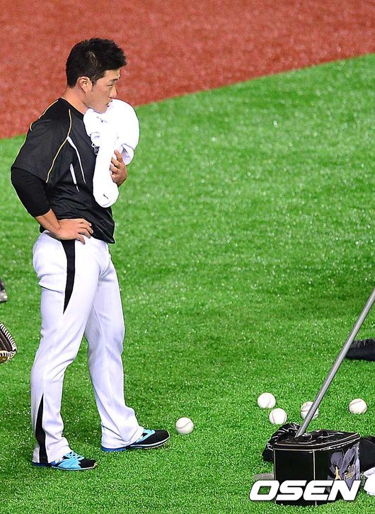 '끝판대장' 오승환이 29일 오후 일본 도쿄돔에서 열리는 '2014 일본프로야구' 요미우리 자이언츠 대 한신 타이거스의 경기를 앞두고 외야에서 훈련을 마친 뒤 땀을 닦고 있다.