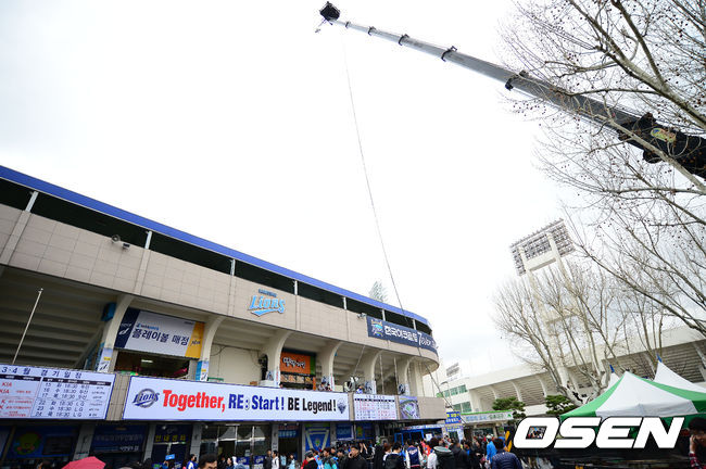 29일 오후 대구 시민구장에서 '2014 한국야쿠르트 세븐 프로야구'삼성 라이온즈와 KIA 타이거즈의 개막전 경기가 열린다. 대구 시민구장에 대형 크레인차가 움직이고 있다.