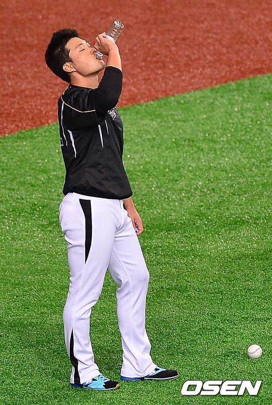 '끝판대장' 오승환이 29일 오후 일본 도쿄돔에서 열리는 '2014 일본프로야구' 요미우리 자이언츠 대 한신 타이거스의 경기를 앞두고 외야에서 훈련을 마친 뒤 음료를 마시고 있다.