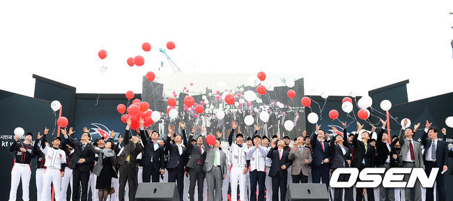 Kt WIZ 선수단과 VIP가 풍선을 하늘에 날리고 있다.