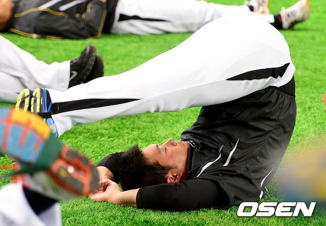 '끝판대장' 오승환이 29일 오후 일본 도쿄돔에서 열리는 '2014 일본프로야구' 요미우리 자이언츠 대 한신 타이거스의 경기를 앞두고 스트레칭으로 몸을 풀고 있다.