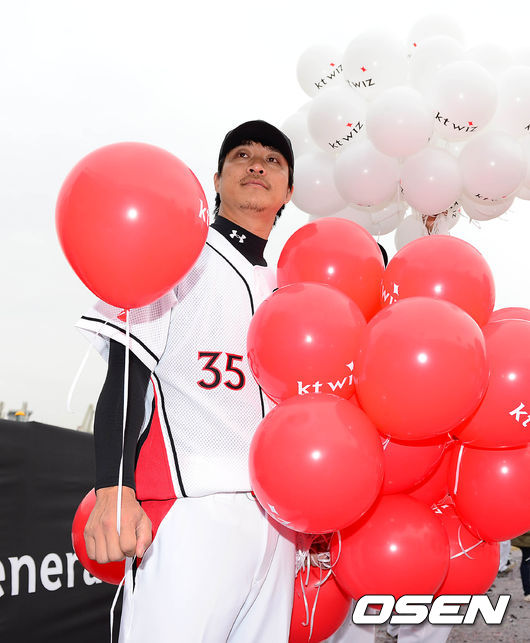 Kt WIZ 신명철이 출정식에 입장하는 팬들에게 풍선을 건네고 있다.