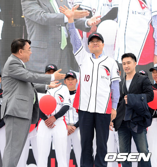 Kt WIZ 명예구단주로 임명된 염태영 수원시장이 팬들에게 인사를 하고 있다.