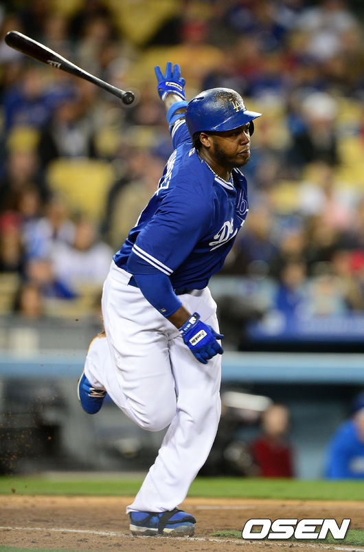 6회말 무사에서 다저스 라미레즈가 안타를 날리고 있다.