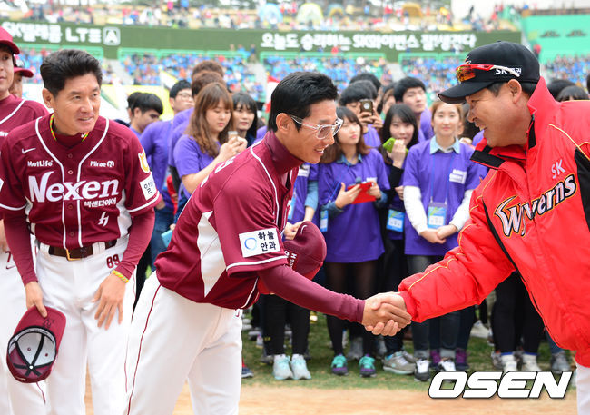 29일 인천 문학구장에서 '2014 한국야쿠르트 세븐 프로야구' 개막전 SK 와이번스와 넥센 히어로즈의 경기가 벌어졌다. 경기 전 이만수 감독이 염경엽 감독과 인사를 하고 있다.