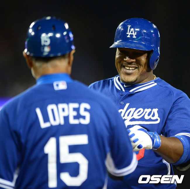 6회말 무사 만루에서 다저스 유리베가 1타점 적시타를 날리고 기뻐하고 있다.