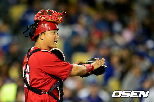 6회말 에인절스 최현(미국명 행크 콩거)이 투수를 격려하고 있다.