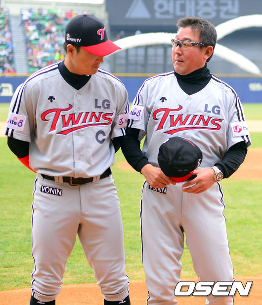 29일 오후 서울 잠실구장에서 열린 '2014 한국야쿠르트 세븐 프로야구' 두산 베어스와 LG 트윈스의 경기에 앞서 LG 김기태 감독이 주장 이진영을 보고 깜짝 놀라고 있다.