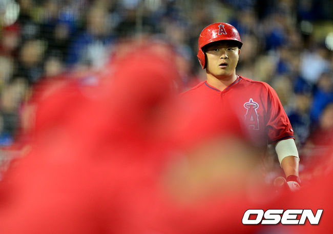 6회초 대기타석에서 준비하던 에인절스 최현(미국명 행크 콩거)이 이닝이 종료되며 더그아웃으로 향하고 있다.