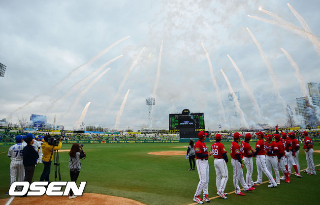 29일 오후 대구 시민구장에서 '2014 한국야쿠르트 세븐 프로야구'삼성 라이온즈와 KIA 타이거즈의 개막전 경기가 열린다. 개막 폭죽이 그라운드 위에서 터지고 있다.
