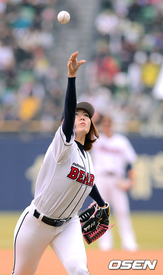 29일 오후 서울 잠실구장에서 열린 '2014 한국야쿠르트 세븐 프로야구' 두산 베어스와 LG 트윈스의 경기에 앞서 스피드스케이팅 이상화가 시구를 하고 있다.