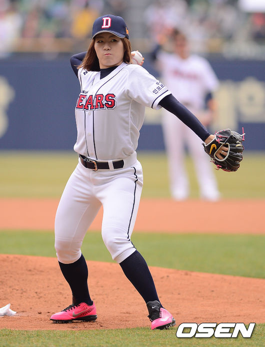 29일 오후 서울 잠실구장에서 열린 '2014 한국야쿠르트 세븐 프로야구' 두산 베어스와 LG 트윈스의 경기에 앞서 스피드스케이팅 이상화가 시구를 하고 있다.