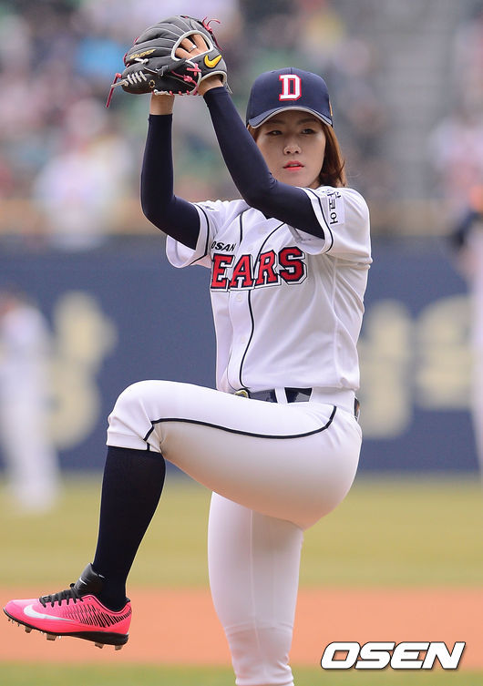 29일 오후 서울 잠실구장에서 열린 '2014 한국야쿠르트 세븐 프로야구' 두산 베어스와 LG 트윈스의 경기에 앞서 스피드스케이팅 이상화가 시구를 하고 있다.