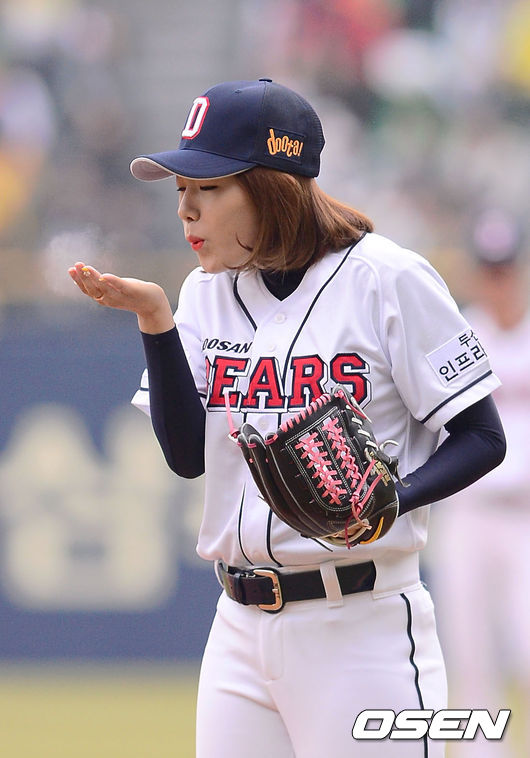 29일 오후 서울 잠실구장에서 열린 '2014 한국야쿠르트 세븐 프로야구' 두산 베어스와 LG 트윈스의 경기에 앞서 스피드스케이팅 이상화가 시구를 하고 있다.
