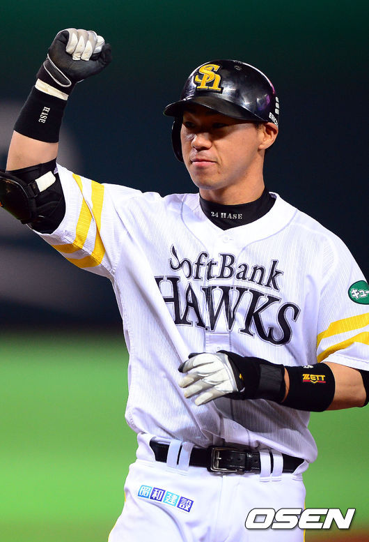 4회말 2사 2루 소프트뱅크 하세가와 유야가 적시타를 때린 뒤 기뻐하고 있다.