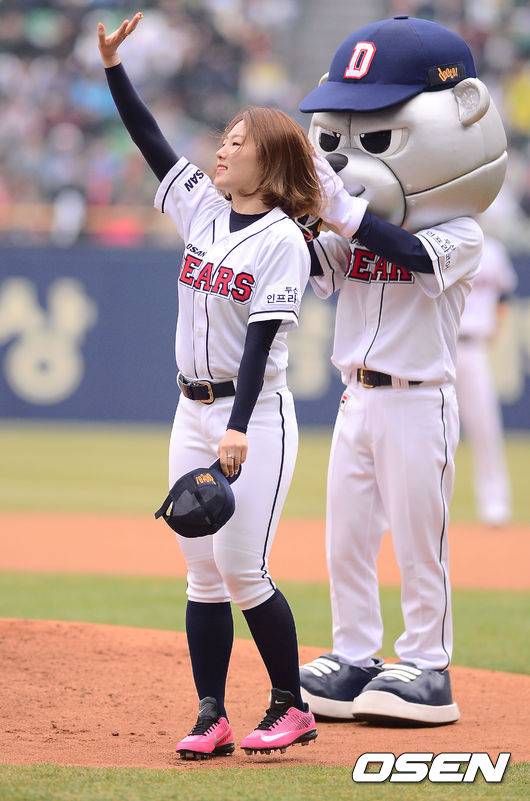 29일 오후 서울 잠실구장에서 열린 '2014 한국야쿠르트 세븐 프로야구' 두산 베어스와 LG 트윈스의 경기에 앞서 스피드스케이팅 이상화가 시구를 하고 있다.