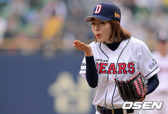 29일 오후 서울 잠실구장에서 열린 '2014 한국야쿠르트 세븐 프로야구' 두산 베어스와 LG 트윈스의 경기에 앞서 스피드스케이팅 이상화가 시구를 하고 있다.