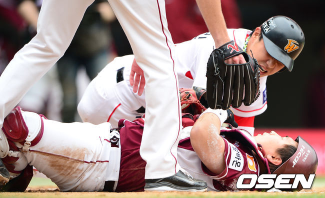 29일 인천 문학구장에서 벌어진 '2014 한국야쿠르트 세븐 프로야구' 개막전 SK 와이번스와 넥센 히어로즈의 경기 1회말 2사 1,2루 이재원의 안타대 2루주자 김강민이 홈을 노렸지만 아웃되고 있다.