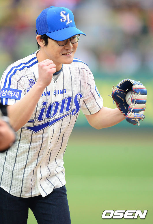 29일 오후 대구 시민구장에서 '2014 한국야쿠르트 세븐 프로야구'삼성 라이온즈와 KIA 타이거즈의 개막전 경기가 열렸다. 경기 전 배우 김성균이 시구를 마친 후 응원을 하고 있다.