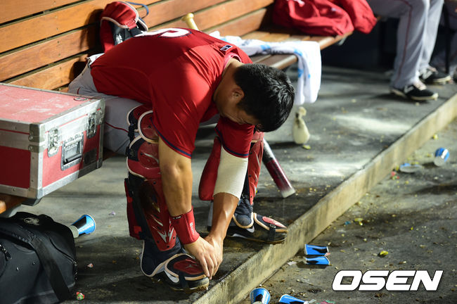 7회말 에인절스 최현(미국명 행크 콩거)이 더그아웃에서 장비를 착용하며 수비를 준비하고 있다.