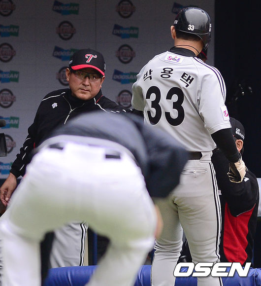 29일 오후 서울 잠실구장에서 열린 '2014 한국야쿠르트 세븐 프로야구' 두산 베어스와 LG 트윈스의 경기, 1회초 2사 만루 LG 정성훈의 밀어내기 볼넷때 3주 주자 박용택이 홈을 밟은후 김기태 감독과 하이파이브를 하고 있다.