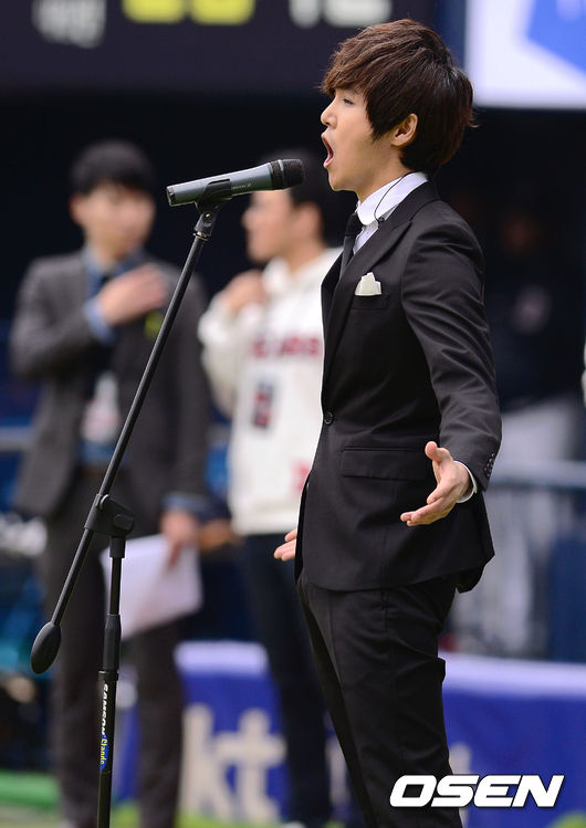 29일 오후 서울 잠실구장에서 열린 '2014 한국야쿠르트 세븐 프로야구' 두산 베어스와 LG 트윈스의 경기에 앞서 가수 정동하가 애국가를 제창하고 있다
