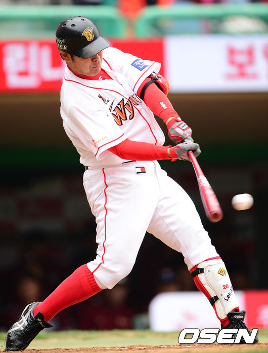 29일 인천 문학구장에서 벌어진 '2014 한국야쿠르트 세븐 프로야구' 개막전 SK 와이번스와 넥센 히어로즈의 경기 1회말 2사 1,2루 이재원이 안타를 치고 있다.
