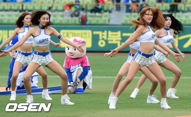 29일 오후 대구 시민구장에서 '2014 한국야쿠르트 세븐 프로야구'삼성 라이온즈와 KIA 타이거즈의 개막전 경기가 열렸다. 경기 전 삼성 치어리더들이 그라운드 위에서 공연을 펼치고 있다.