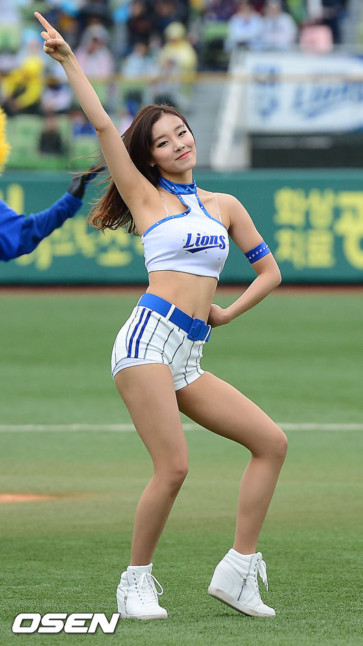 29일 오후 대구 시민구장에서 '2014 한국야쿠르트 세븐 프로야구'삼성 라이온즈와 KIA 타이거즈의 개막전 경기가 열렸다. 경기 전 삼성 치어리더들이 그라운드 위에서 공연을 펼치고 있다.