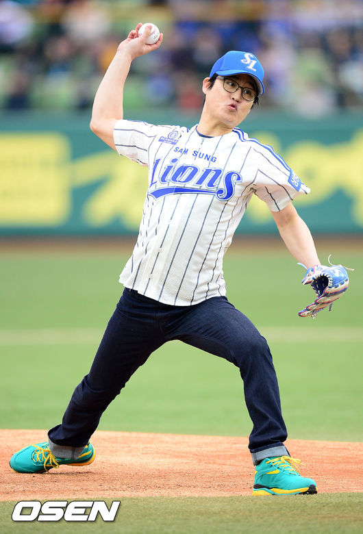 29일 오후 대구 시민구장에서 '2014 한국야쿠르트 세븐 프로야구'삼성 라이온즈와 KIA 타이거즈의 개막전 경기가 열렸다. 경기 전 배우 김성균이 시구를 하고 있다.