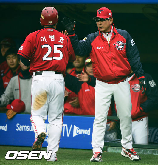 29일 오후 대구 시민구장에서 '2014 한국야쿠르트 세븐 프로야구'삼성 라이온즈와 KIA 타이거즈의 개막전 경기가 열렸다. 1회초 2사 주자 1루 KIA 신종길의 중견수 뒤 1타점 적시타 때 이범호가 홈으로 몸을 날려 세이프 된 후 한대화 코치와 하이파이브를 하고 있다.