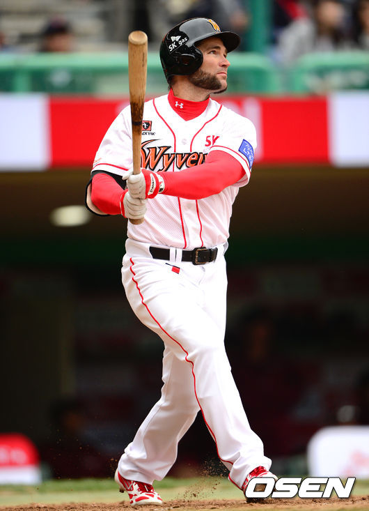 29일 인천 문학구장에서 벌어진 '2014 한국야쿠르트 세븐 프로야구' 개막전 SK 와이번스와 넥센 히어로즈의 경기 3회말 2사 스캇이 동점 솔로홈런을 치고 타구를 바라보고 있다.