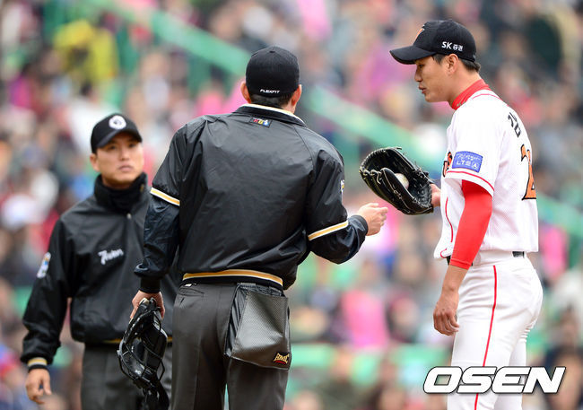 그런데 이택근 타석에서 1구를 던진 김광현이 나광남 주심에게 뭔가를 어필하기 시작했다. 3루쪽 움직임과 연관이 있어 보였다. 김광현은 나 주심에 이어 권영철 3루심에게도 뭔가의 상황을 설명했다.