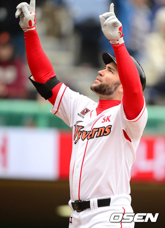 29일 인천 문학구장에서 벌어진 '2014 한국야쿠르트 세븐 프로야구' 개막전 SK 와이번스와 넥센 히어로즈의 경기 3회말 2사 스캇이 동점 솔로홈런을 치고 홈에서 세레모니를 펼치고 있다.