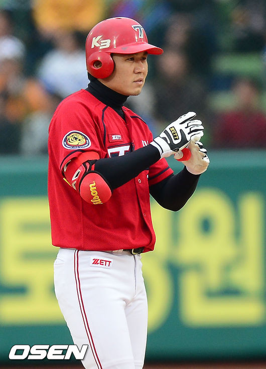 29일 오후 대구 시민구장에서 '2014 한국야쿠르트 세븐 프로야구'삼성 라이온즈와 KIA 타이거즈의 개막전 경기가 열렸다. 1회초 2사 주자 1루 KIA 신종길이 중견수 뒤 1타점 적시타를 날린 후 2루에서 사인을 보내고 있다.