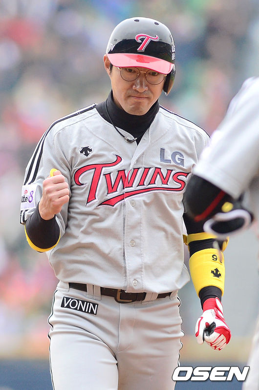 29일 오후 서울 잠실구장에서 열린 '2014 한국야쿠르트 세븐 프로야구' 두산 베어스와 LG 트윈스의 경기, 3회초 2사 1,2루 LG 정성훈이 1타점 적시타를 날린후 환호하고 있다.