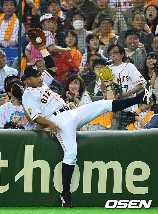 3회초 한신 공격 무사 1, 2루 상황 4번타자 고메즈의 파울 타구를 요미우리 1루수 호세 로페즈가 관중석으로 들어가며 잡아내고 있다.