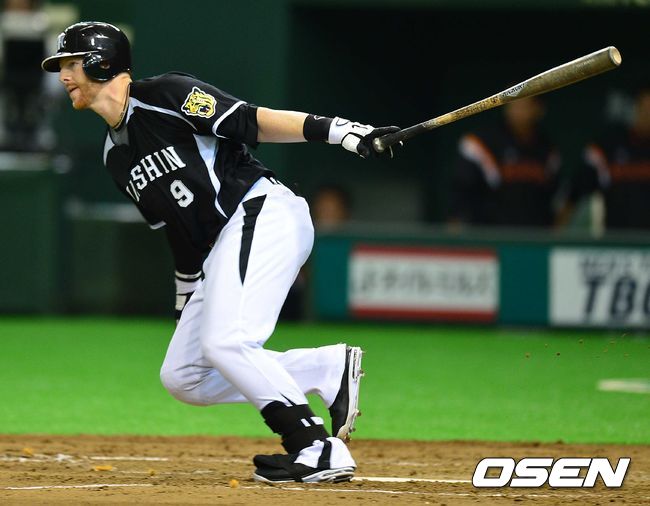 3회초 한신 공격 1사 2, 3루 상황 맷 머튼이 1타점 좌전안타를 날리고 있다.