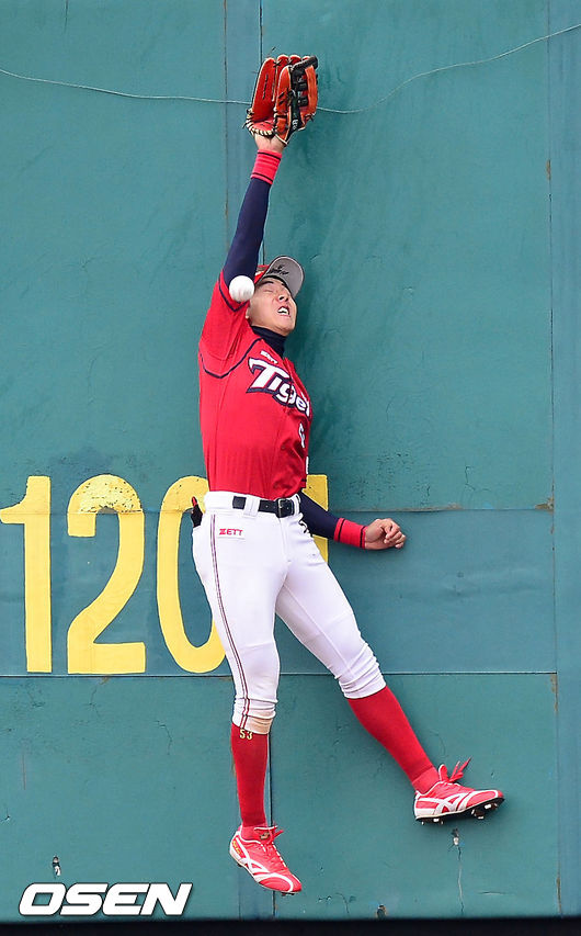 29일 오후 대구 시민구장에서 열린 '2014 한국야쿠르트 세븐 프로야구'삼성 라이온즈와 KIA 타이거즈의 개막전, 4회말 2사 주자 없는 상황에서 삼성 박석민의 타구를 KIA 중견수 이대형이 뛰어올랐지만 잡아내지 못하고 있다.