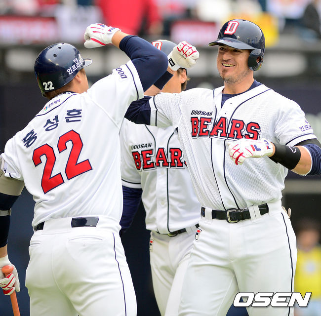 29일 오후 서울 잠실구장에서 열린 '2014 한국야쿠르트 세븐 프로야구' 두산 베어스와 LG 트윈스의 경기, 3회말 2사 1,3루 두산 칸투가 역전 3점 홈런을 날리고 동료들의 축하를 받고 있다.