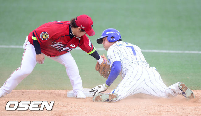 29일 오후 대구 시민구장에서 열린 '2014 한국야쿠르트 세븐 프로야구'삼성 라이온즈와 KIA 타이거즈의 개막전, 5회말 1사 주자 1루 삼성 정형식 타석에서 1루 주자 김상수가 2루 도루에 성공하고 있다.
