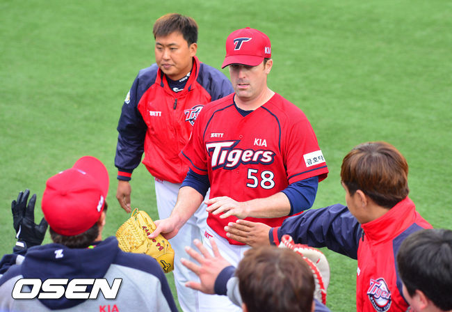 29일 오후 대구 시민구장에서 열린 '2014 한국야쿠르트 세븐 프로야구'삼성 라이온즈와 KIA 타이거즈의 개막전, 5이닝을 마친 KIA 선발 홀튼이 덕아웃으로 들어오며 동료들과 하이파이브를 하고 있다.